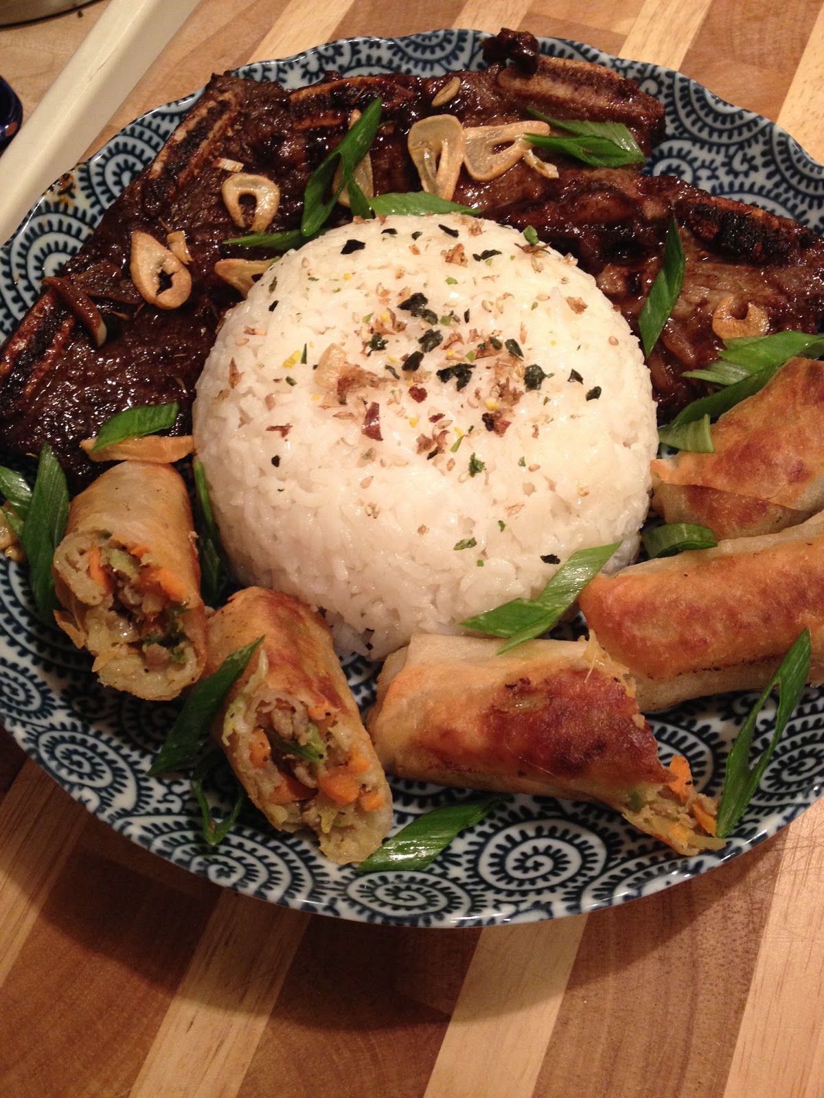 Over a period of two days, I created two Asian inspired dinners. Sometimes I just get a craving and I enjoy the creative process. Two of my favorites of Asian-Polynesian foods is my mother-in-law's fried rice and Korean BBQ ribs. In addition, I am obsessed with lumpia, which, while not too difficult to prep, is time consuming. I keep threatening to make it, but the proper time needed keeps eluding me. Curses! Some day! In the meantime, this is the tale of two dinners. To start with, the feast of lumpia, sweet mirin rice and Korean BBQ Ribs.